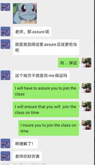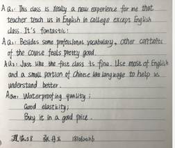 在线下的交流和讨论中, 很多同学都单独添加了我的微信, 有什么问题随时在微信上和我直接沟通, 除了课程之外的问题, 还有很多关于英文的问题, 我们相互探讨,甚是欢心。到目前为止, 我发现同学们的写作能力普遍提高, 由开始的几个单词回答问题, 到现在的几段话回答作业,在后边的教学过程中, 我希望可以提高同学们阅读,听力,写作的基础上, 提高他们的语感和口头表达能力。