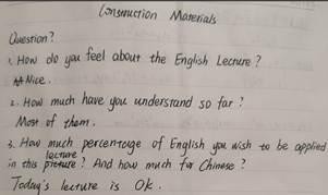 建筑材料这门课程内容偏多,偏广,为了使同学在学习过程中了解重点及其英文表达, 课后的作业显得至关重要,除了一些课本要求的课后问题外,我还引申了一些关于建筑材料发展的理念和未来趋势的思考, 比如Sustainability, Green Material,通过这些课本中没有答案的问题,引导同学们通过自己的理解和查询去挖掘对这些基本理念的理解, 并使用英文表达出来。 从同学们的作业中, 我可以看到他们的自主查询思考的努力,每个人的答案非常类似,但几乎没有重复。 这是我在教学中反复强调的学习态度,注重自主独立性的思考,同时兼听则明。同时也是在语言学习中对文化理解过程中不可避免的一部分内容, 需要拓宽视野,通融知识,这样才能提升素质,成为双语型的人才。