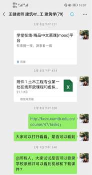 网络教学手段虽然比较成熟,但是对于我和很多的同学们来说, 还是第一次。为了了解同学们在家里所拥有的网络资源和上网方式,我首先尝试通过微信建群的方式,把上课的同学们都加入到这门课程的班级群里,欣慰的是所有同学都可以使用微信联系到,这样为硬件准备具备了一个坚实的基础,并实现了沟通保障。同时督导组的老师也顺利的加入。接着就是通过接龙程序,统计得出了同学们在家里所拥有的网络资源和上网方式,结果是所有同学都可以上网和使用手机,只有2个同学没有电脑。根据这样良好的状况, 我决定使用直播的方式授课,使大家进入有规律的作息和学习。