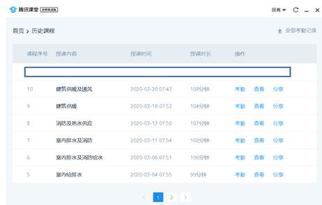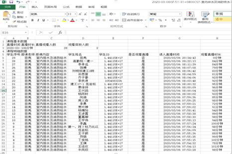 通过五周的网络授课,感觉采取直播方式更有助于跟学生的互动交流。值得推荐的是腾讯课堂的回放、考勤功能。回放功能可以使同学们及时回看上课内容,同时具有倍速播放,重点的、模糊的地方可以反复听讲、学习,这是课堂教学无法比拟的优势,学习时间也更自由。考勤功能可以导出excel,包含每节课和全部考勤统计。可以了解学生进入课堂时间,观看直播、回放的时长。不足之处,敬请大家批评指正!