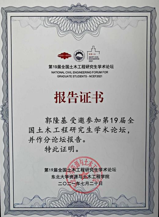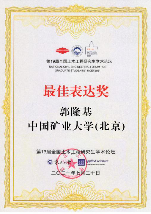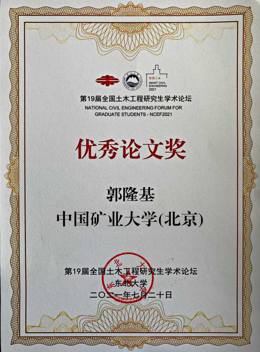 最终雷竞技官网郭隆基博士在同济大学、浙江大学、吉林大学等一众知名985高校博士、硕士中脱颖而出,获得“最佳表达奖”(全国仅8个)、“优秀论文奖”,且“NPR锚杆/索围岩动力响应及工程应用”相应论文被推荐至《东北大学学报(自然科学版)》(全国仅18篇)。