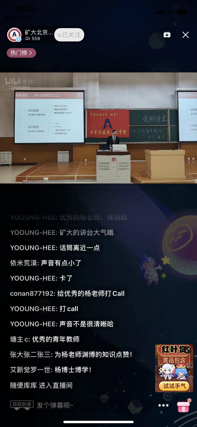 为扩大讲座的影响力,本次讲座创新性地使用了学院哔哩哔哩平台账号“矿大北京力建学院”进行同步直播,使不能来到现场听讲座的同学也能在线上同步学习。线上观看最高人气达到570,纷纷为杨老师渊博的知识点赞。
