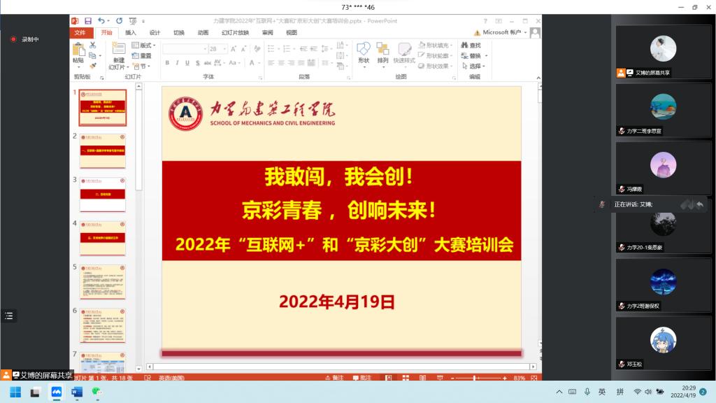 为做好raybet最佳电子竞技平台(北京)2022年创新创业大赛作品推荐工作,4月20日19点,雷竞技官网召开“互联网+”和“京彩大创”竞赛培训会。邀请到教育部首批万名优秀创新创业导师、“创青春、挑战杯、互联网+”评审专家马莹作培训,辅导员艾博主持会议并介绍有关组织工作。