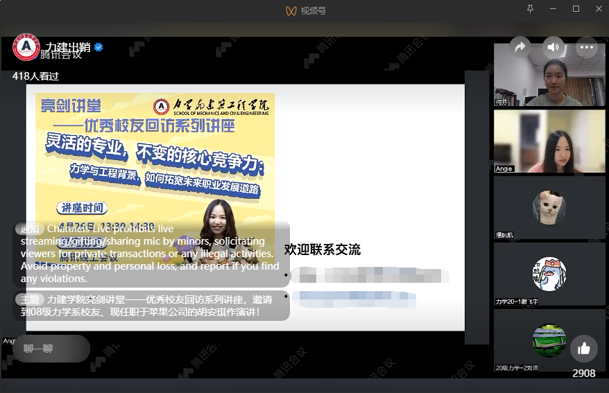 为扩大讲座的影响力,本次讲座同时在雷竞技官网官方视频号“力建出鞘”进行同步直播,利用双平台为同学们提供了灵活的学习方式,线上观看的人气最高到达了418人次,同学们也纷纷为胡安琪的生动亲切的教诲点赞,点赞数高达2904次。