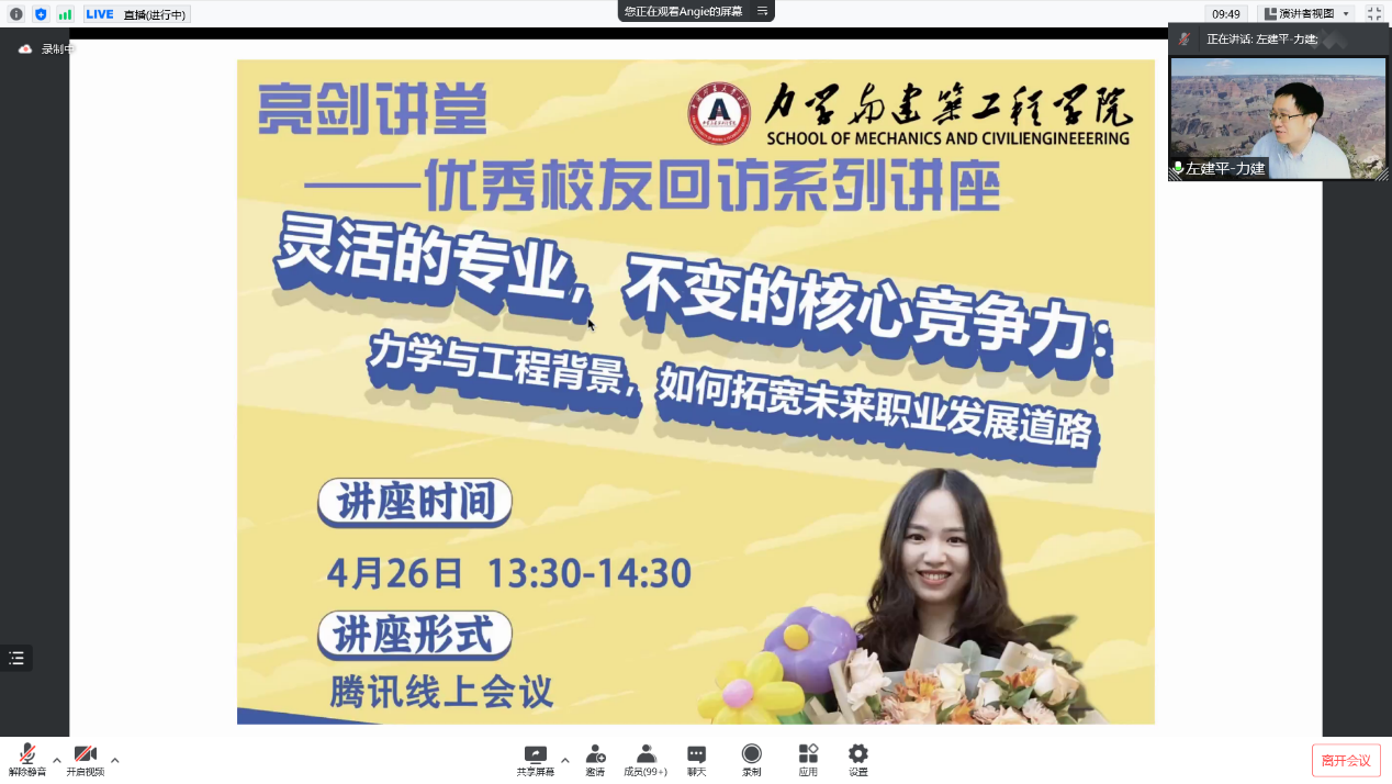 讲座伊始,左建平院长发表讲话。他对胡安琪为雷竞技官网师生做主题讲座表示欢迎和感谢,并与胡安琪交流了关于在母校学习生活方面的往事,展现了十分融洽的师生关系。左建平院长提到,力学是一门基础学科,也是一门应用学科,尽管力学很难学,但力学专业培养出许多优秀人才。左建平院长鼓励在线上学习的同学们保持积极向上的心,要认真、踏实地学习。最后左建平院长表示,无论所学专业难与否,只要认真学、学好、学有所成,就会有所成长。