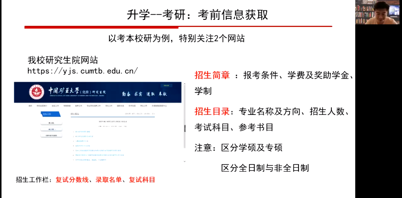 随后,范露康老师详细地讲述升学和就业过程中信息的搜集方法和需要注意的具体问题。强调考研要早规划,认真备考;选择就业要多实习,同时要掌握技能,提升核心竞争力。叮嘱同学们在未来的规划中上不要盲目跟风,要有自己的主见,适合自己才是最好的。