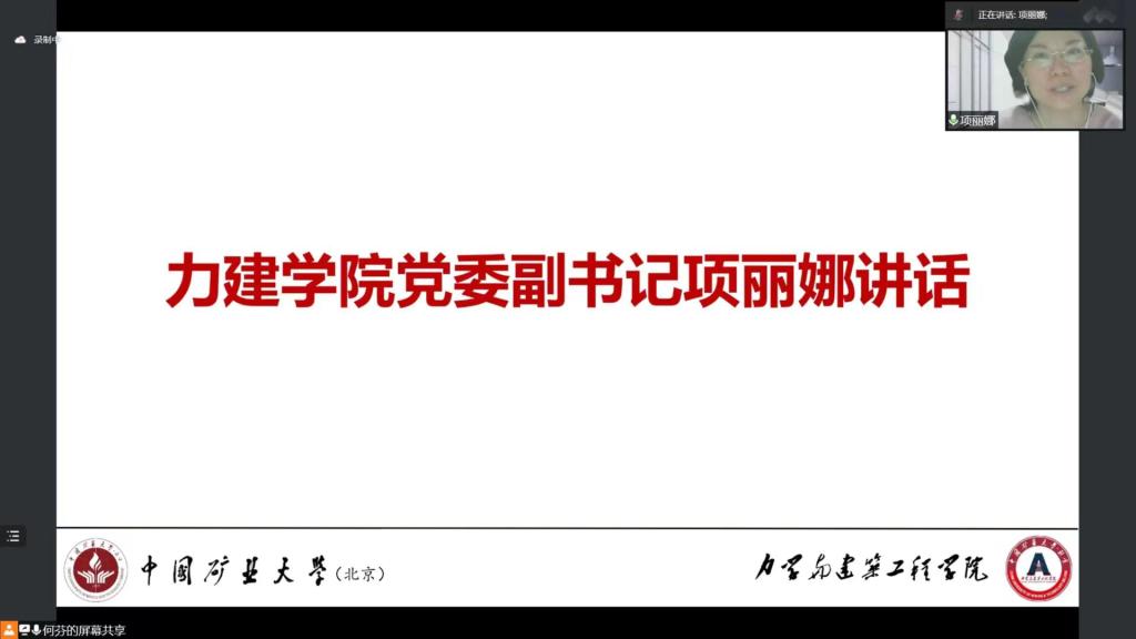 会议伊始,项丽娜老师发表讲话。她代表学院向2020级全体同学表达许久未见的思念之情,强调现阶段心态至关重要,线上教学容易迷失方向,产生焦虑心理,遇到困难要及时疏通,老师们一直坚守在岗位上,时刻为同学们服务。叮嘱同学们要深怀大爱,积极参加志愿服务;比学赶超,步步登高;做好生涯规划,明确自己的目标。