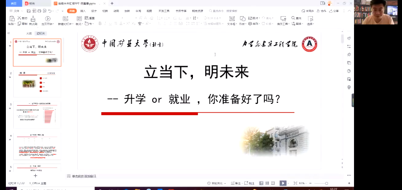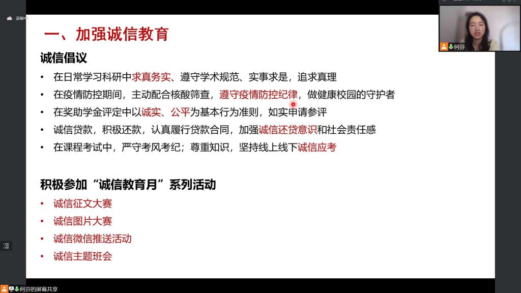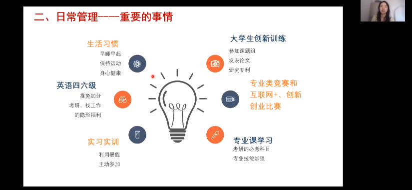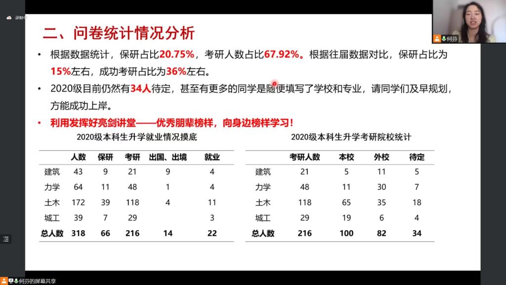 首先是来自何芬老师的分享,她从往届就业升学情况、2020级就业升学初统计、2020级学业情况分析、诚信教育和日常管理四个方面展开讲述。明未来——通过往届就业升学详实的数据分析和本年级同学就业升学意向的数据统计,推荐同学们积极参加“亮剑讲堂——优秀朋辈榜样系列讲座”,强调就业升学方向的选择应该科学理性,及早规划;立当下——将大学重要阶段分时间轴进行展示,叮嘱同学们积极认真备考期末考试月,诚信应考。利用暑假积极参加实习实践,提升综合能力。