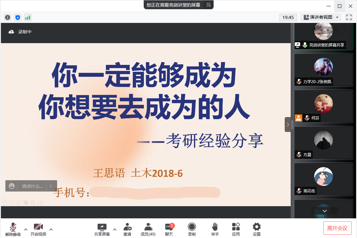 第一个进行分享的是考研到我校土木工程专硕的王思语学姐。她首先分享报考的经历,提醒同学们要慎重考虑、理性选择;其次分享考研的经验,强调要抱着积极乐观的考研心态,减少不必要的焦虑,满怀希望才能所向披靡