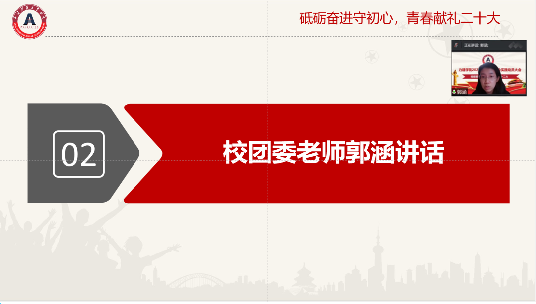 项书记强调了此次社会实践活动意义重大,我们不仅要有热情更要有方向。疫情期间,同学们可以采用线上线下相结合的形式,项书记鼓励同学们在疫情防护安全的前提下,尽可能有切实的行动,做到高质量参加,提升实践中的成果意识。项书记还强调同学们不仅要在实践过程当中积累经验,还要做出成绩、亮出实干,通过实践活动回馈社会、报效祖国。
