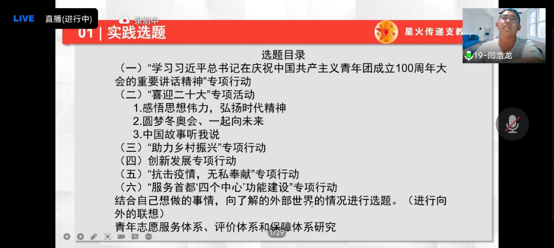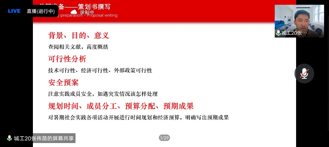 闫浩龙同学从自己社会实践的亲身经历和感受出发,为参会成员们介绍了如何组建团队、实施计划、线上线下结合进行宣传以及各类注意事项等。并强调了组织活动中团队成员们要集思广益,在实践中随时保持交流,思想碰撞出的火花是开阔创新思路的一个必要前提.