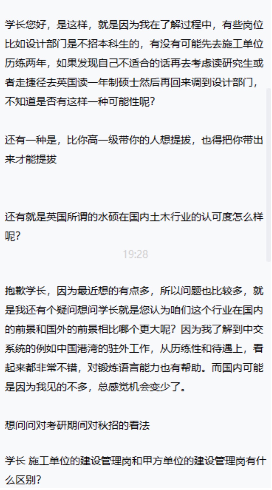 王治理从土木工程行业未来的研判、土木工程就业方向、土木工程真实工作情况和薪资、考研、出国、就业如何平衡四个方面出发,结合自身求学及在中建一局的工作经历,详细讲解了自身对土木工程行业的理解,并强调了“在疫情形势下,要做一个创造价值的人,而不是消耗价值的人”。王治理与同学们探讨了土木专业考研的必要性和考研优缺点,将“考研”比作“考驾证”,以自身经历建议同学们在参加秋招的同时全力以赴备战考研保研。同时与同学们分享土木工程出国就业的优缺点,建议同学们将出国利弊考虑清楚后再做决定。最后,王治理祝福在场的同学都能在应聘时签约到理想的工作岗位。